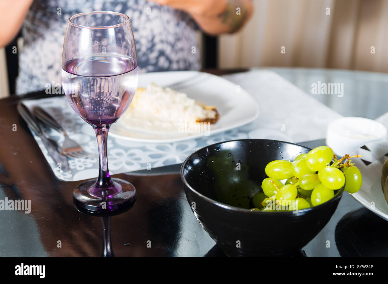 Classy Dinner Table Setting With Black Bowl Of Green Grapes In