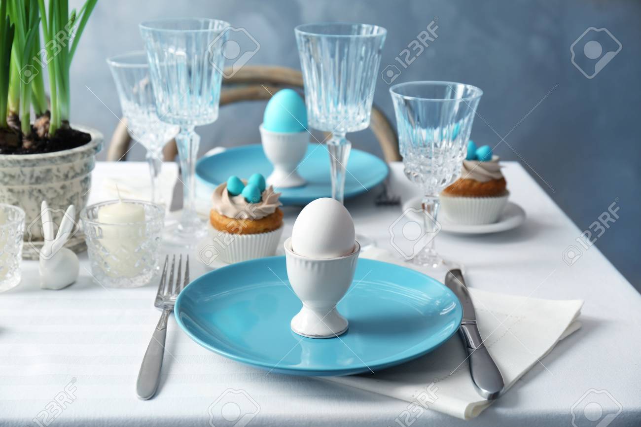 Beautiful Easter Table Setting With Blue Plate Stock Photo