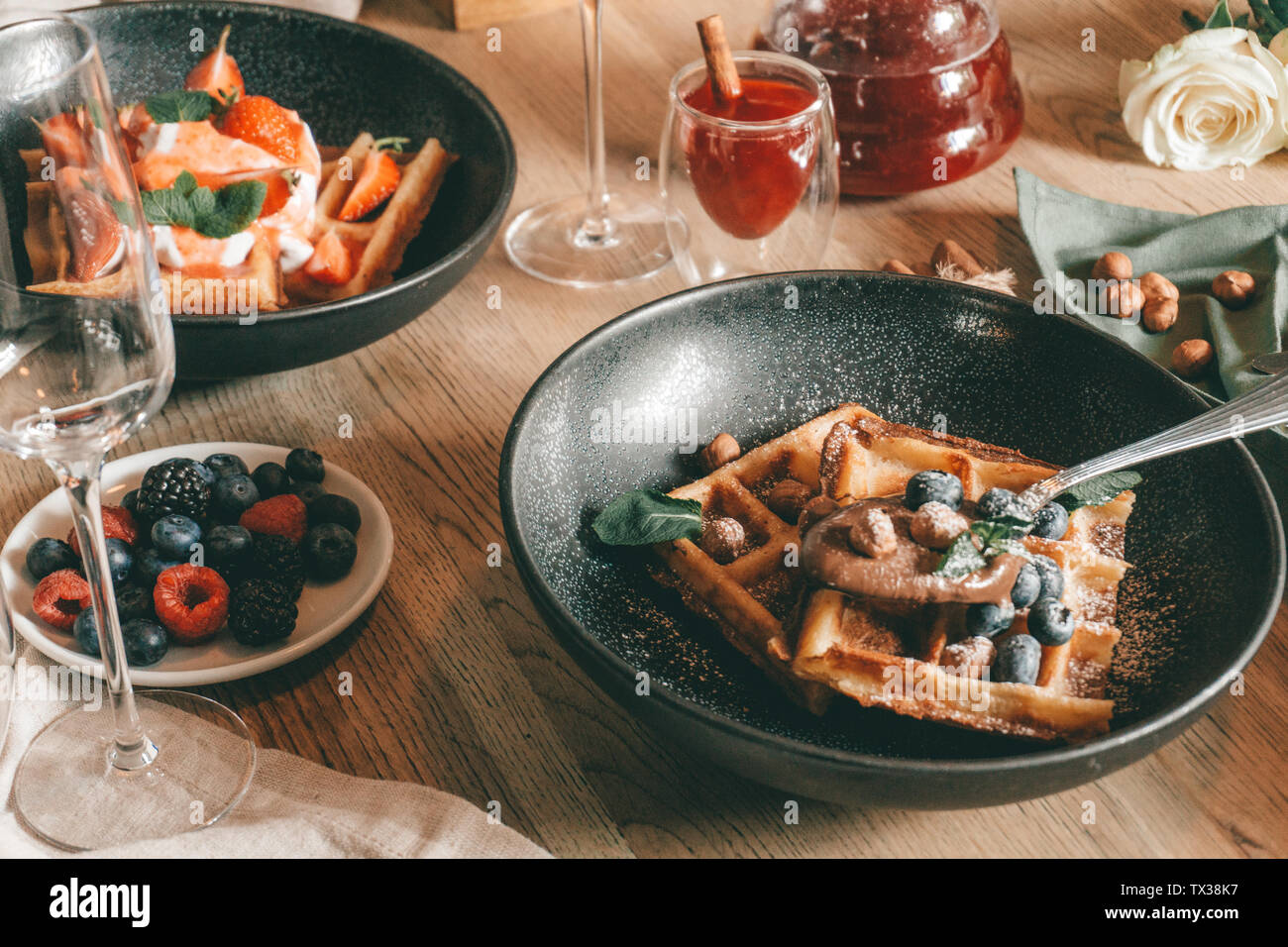 Belgian Waffles With Berries Ice Cream And Chocolate Breakfast