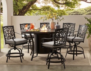 Find the perfect patio furniture backyard decor at hayneedle where you can buy online while you explore our room designs and curated looks for tips ideas inspiration to help you along the way. Fire pit outdoor bar height dining 7 piece set cast aluminum patio furniture sunbrella cushions. Roast up some smores and stay cozy with our modular fire chat sets or rustic wooden fire tables.