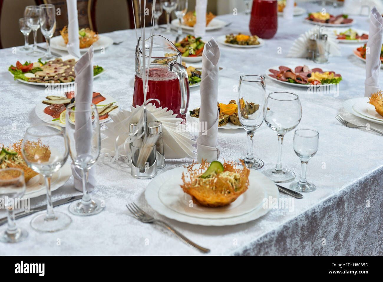 Table Setting In Restaurant With Greek Salad And Wine Stock Photo