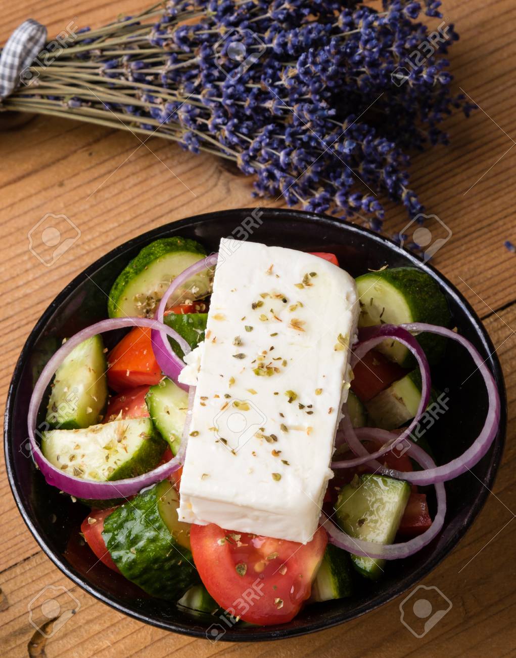 Fresh Healthy Greek Salad In Rustic Table Setting Stock Photo