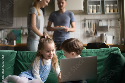 Little Girl And Boy Son And Daughter Using Laptop Looking At