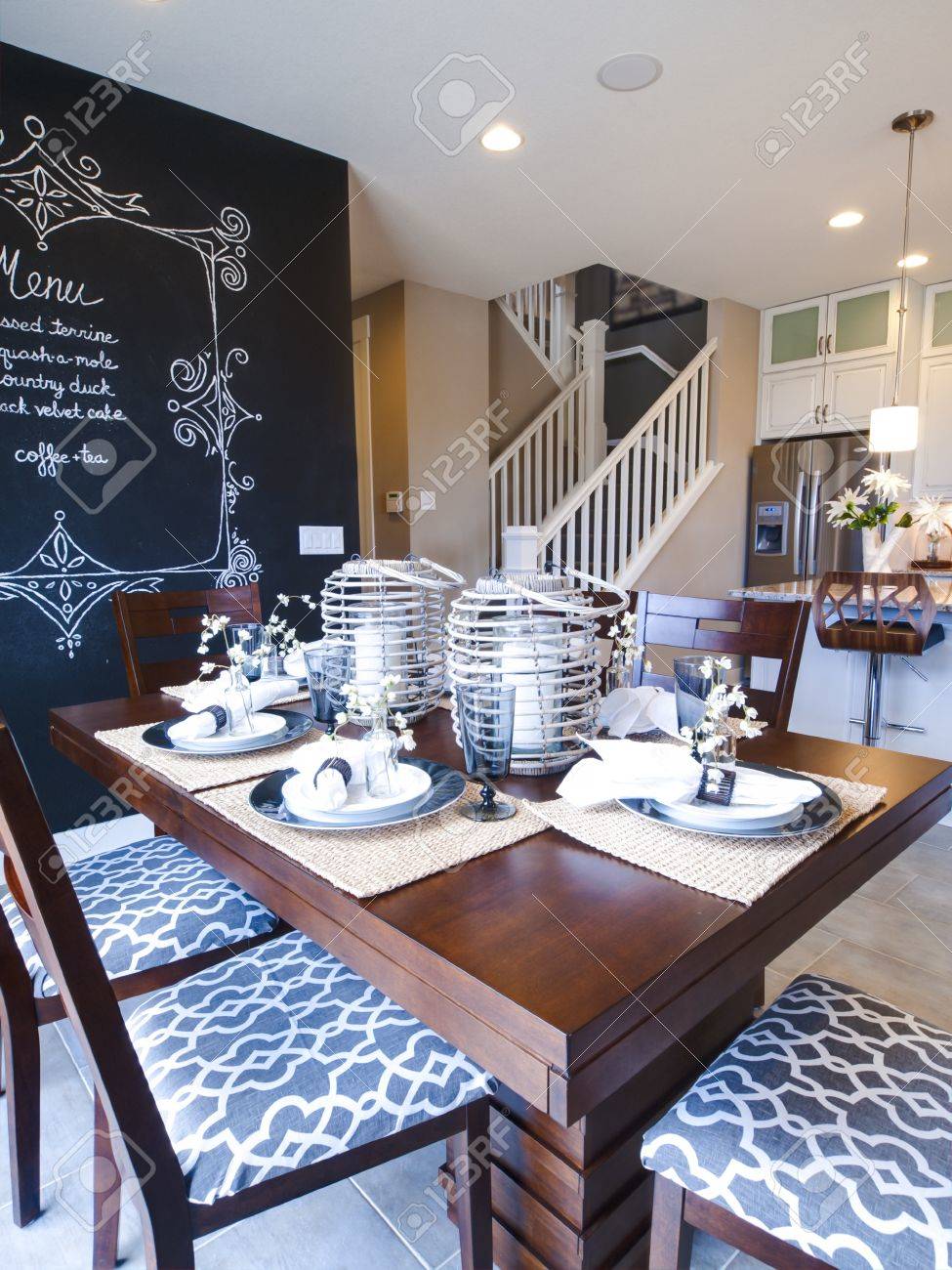 Modern Dining Room With Table Set For Family Dinner Stock Photo