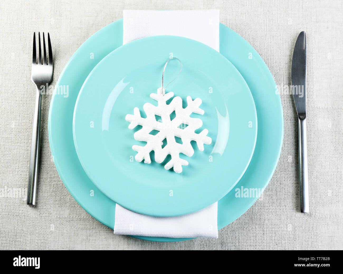Stylish Blue And White Christmas Table Setting On Grey Tablecloth