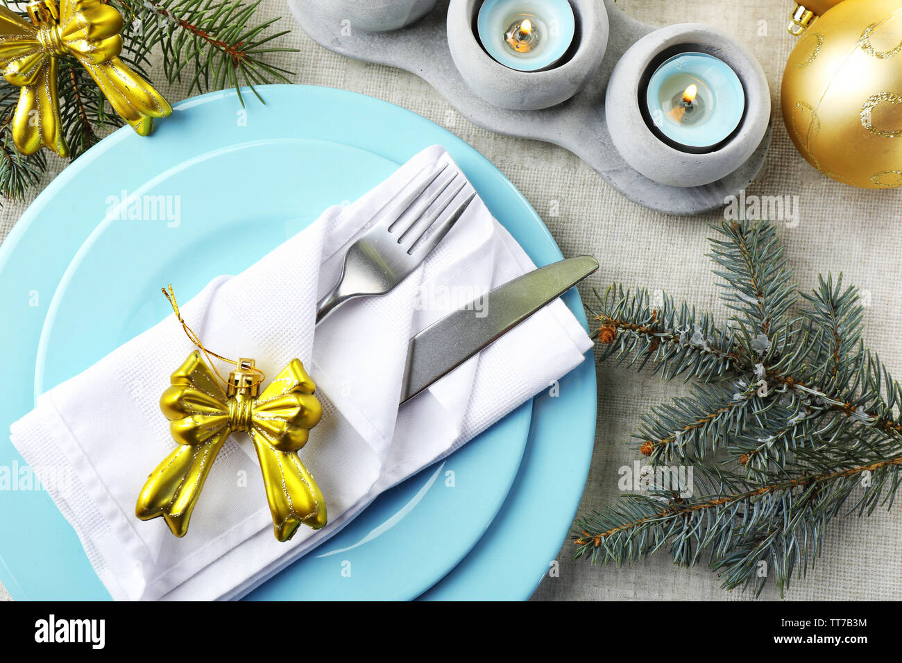 Christmas Table Setting In Blue Golden And Whitec Olors On Grey