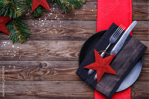 Christmas Table Place Setting With Black Plate Fork And Knife