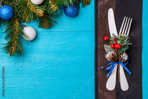 Christmas Table Place Setting Decorated Black Napkin With Fork And