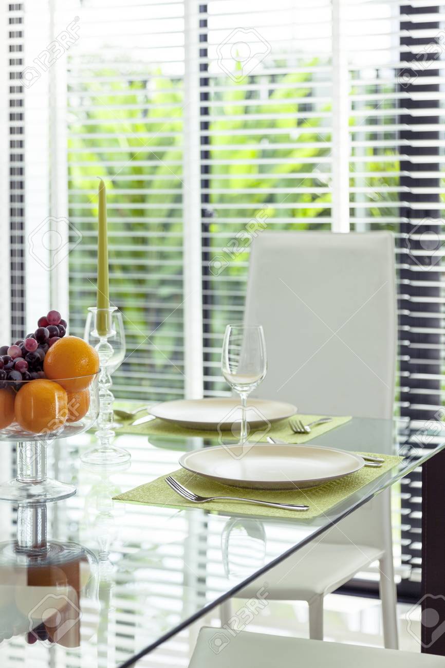 Dining Table With Dinner Set Fruit And Wine Glass With Garden