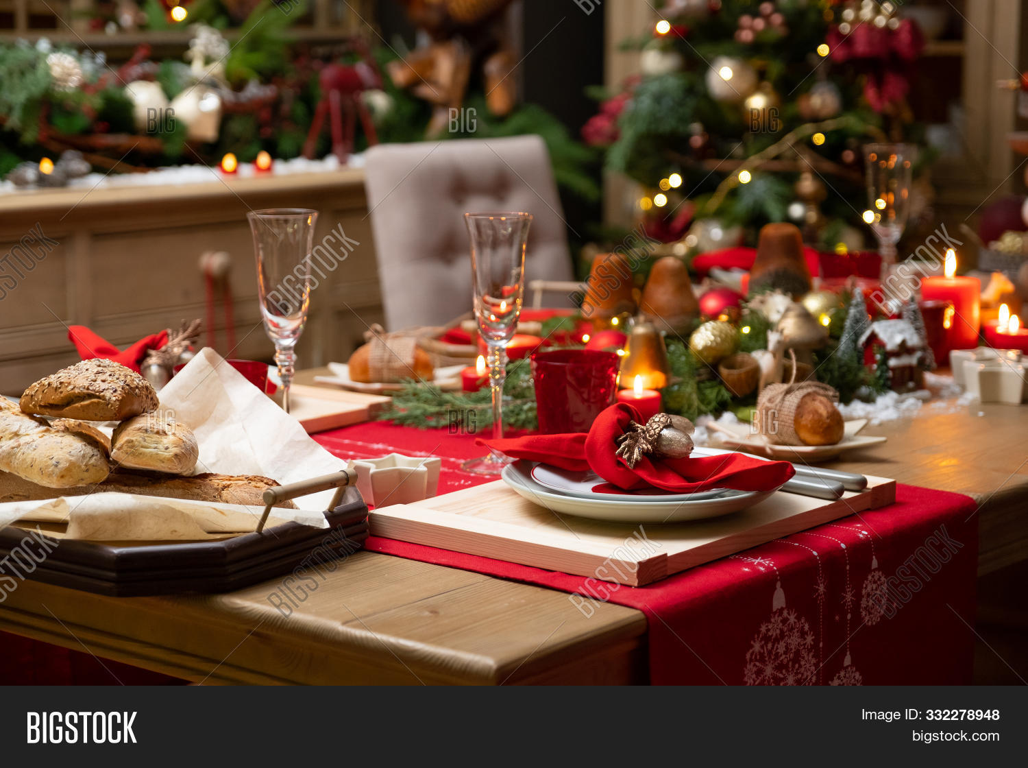 Beautiful Table Setting With Kitchen At Background Stock Photo