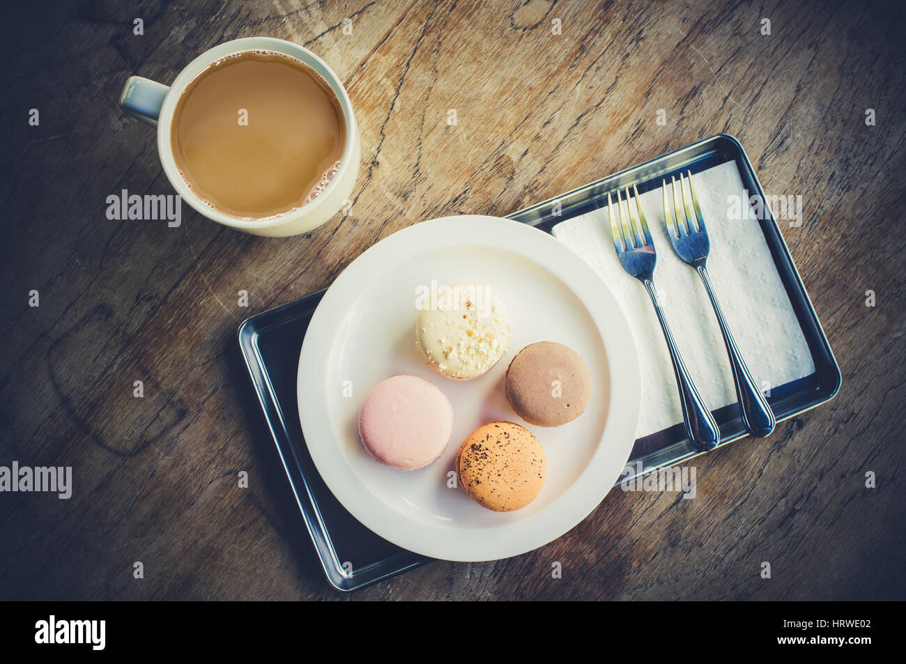 Cup Of Coffee With Macarons Set On Wooden Table Top View With