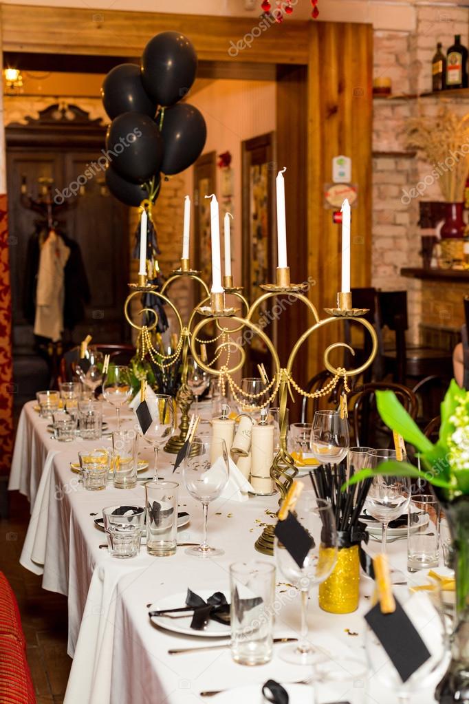 Birthday black and gold table setting. Decorate your hall adapting any of these black and white wedding table settings and youre sure to enjoy a classy reception with family and friends. A table set for a semi formal dinner on a wrought iron glass topped table. Black and gold chargers and plates and welcome add gold cutlery and glasses place white blooms in gold and black vases for a fresh touch.