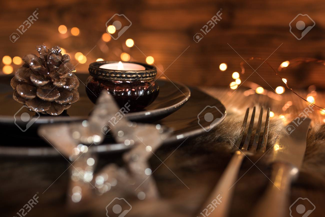 Rustic Christmas Table Setting With Candle Vintage Or Rustic