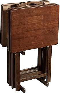 Free shipping for many products. Made of 100 percent solid wood this set includes 4 folding tables and a convenient storage stand which is great for transportation. Perfect for tv meals or family meals that make their way out of the kitchen or dining room.