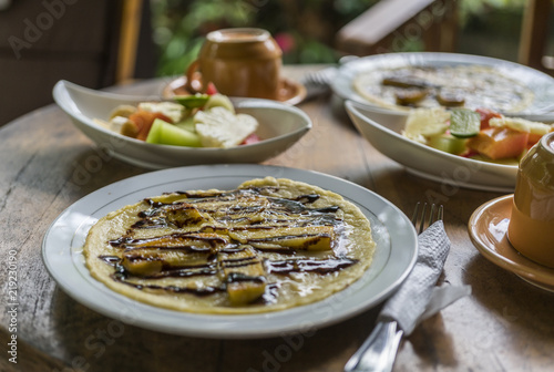 Breakfast Table Setting With Banana Omelet And Fresh Mixed Fruit
