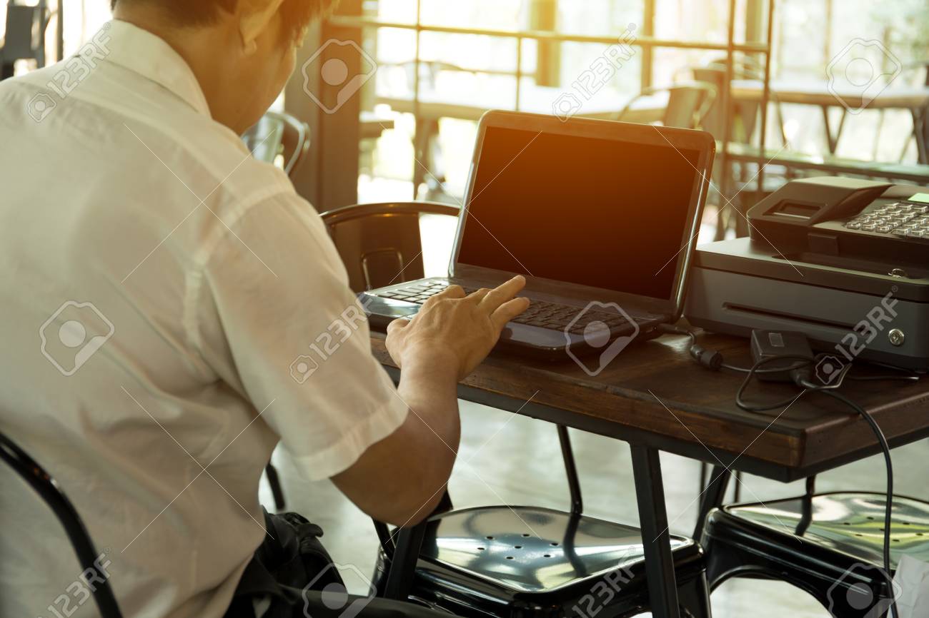 Cashier Operating Man Set Up Cash Register With Notebook In Coffee