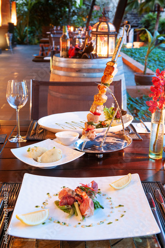 Luxury Resort Restaurant Dinner Table Setting With Barbecue And