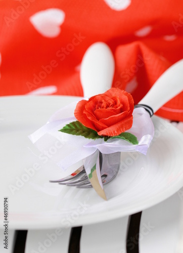 Romantic Dinner Concept Table Setting With Cutlery And Red Rose